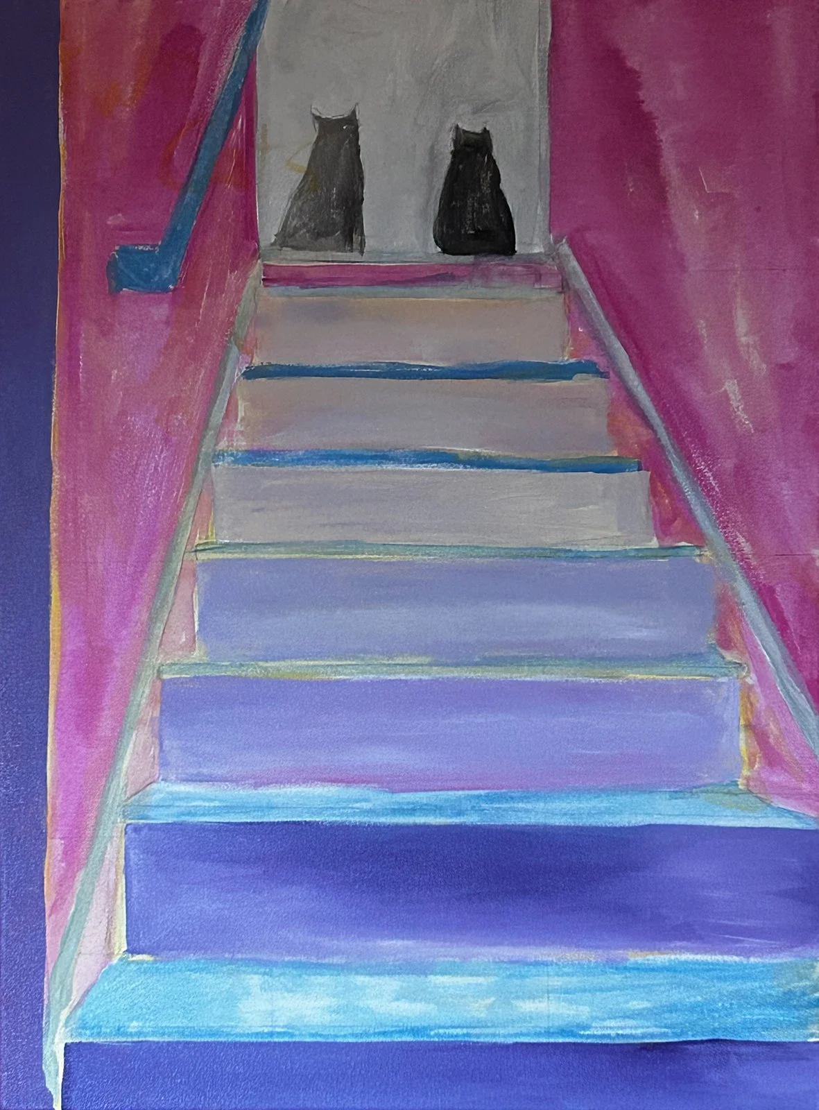 There’s this piece. I was delighted when I looked up to see my daughter’s two cats staring back at me. The graduated shadow on the steps caught my eye, as well. Snap… gotta paint this!
