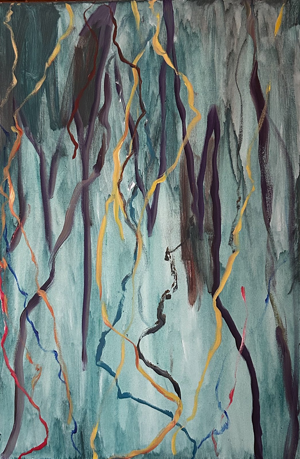 Working on abstracts has made its way into my repertoire as a way to be thrifty and a kind of meditative practice. It allows me to slow down my thinking and clear my head. I’ll take a brush still loaded with paint that I don’t need anymore from one piece, and apply it to another waiting canvas. It’s a nice break from the hard work of wrestling out the composition I’m trying to achieve in my more subjective work, and I like saving the matter from landfills or the watershed. After applying numerous “whatever I feel like” strokes, the colors and lines begin to relate. Ultimately, they dictate what comes next.